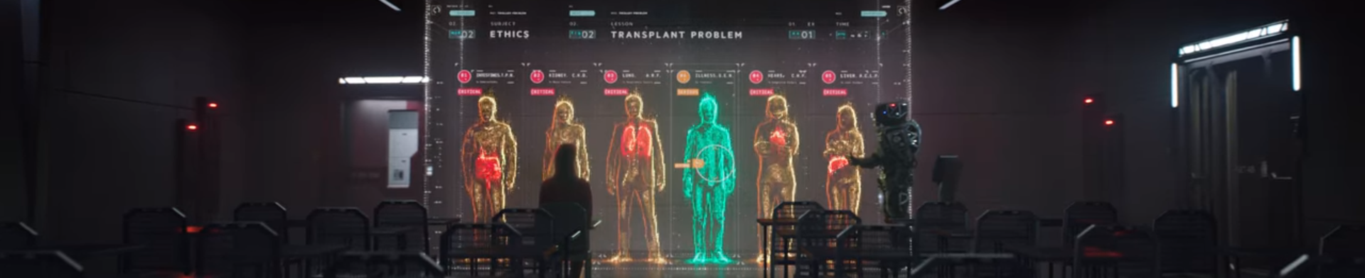 Fillesuit l’enseignement de Mère. Durant ses leçons, elle apprendprincipalementles doctrines de nombreux philosophes réels. Pendant l’une d’entre elles, Fille est placée devant un dilemme qui la force à choisir entre une vie à sauver pour en perdre cinq, ou laisser mourir cette personne pour sauver les cinq autres. Cet exercice est une expérience de pensée de philosophie morale expérimentalenotamment proposée par le philosophe français Rowen Ogien dans son livre « L’Influence de l’odeur des croissants chauds sur la bonté humaine », publié en 2012. Mère teste en réalité l’éthique de sa fille, après avoir suivi l’enseignement philosophique qu’elle lui a choisi.